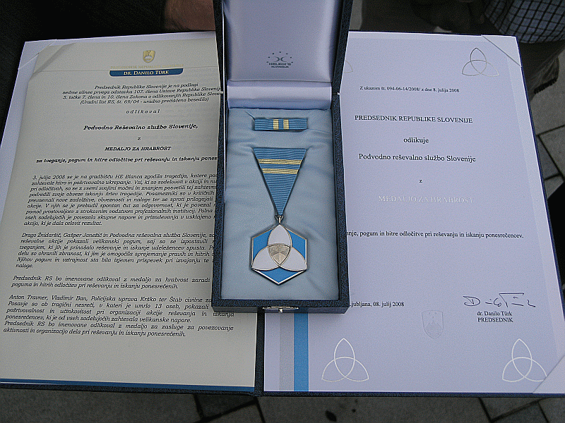 Predsednik Republike Slovenije dr. Danilo Türk je 14. 7. 2008 v kristalni dvorani dvorca Brdo pri Kranju za tveganje, pogum in hitre odločitve pri reševanju in iskanju ponesrečencev na reki Savi pri HE Blanca odlikoval Podvodno reševalno službo Slovenije z Medaljo za hrabrost.